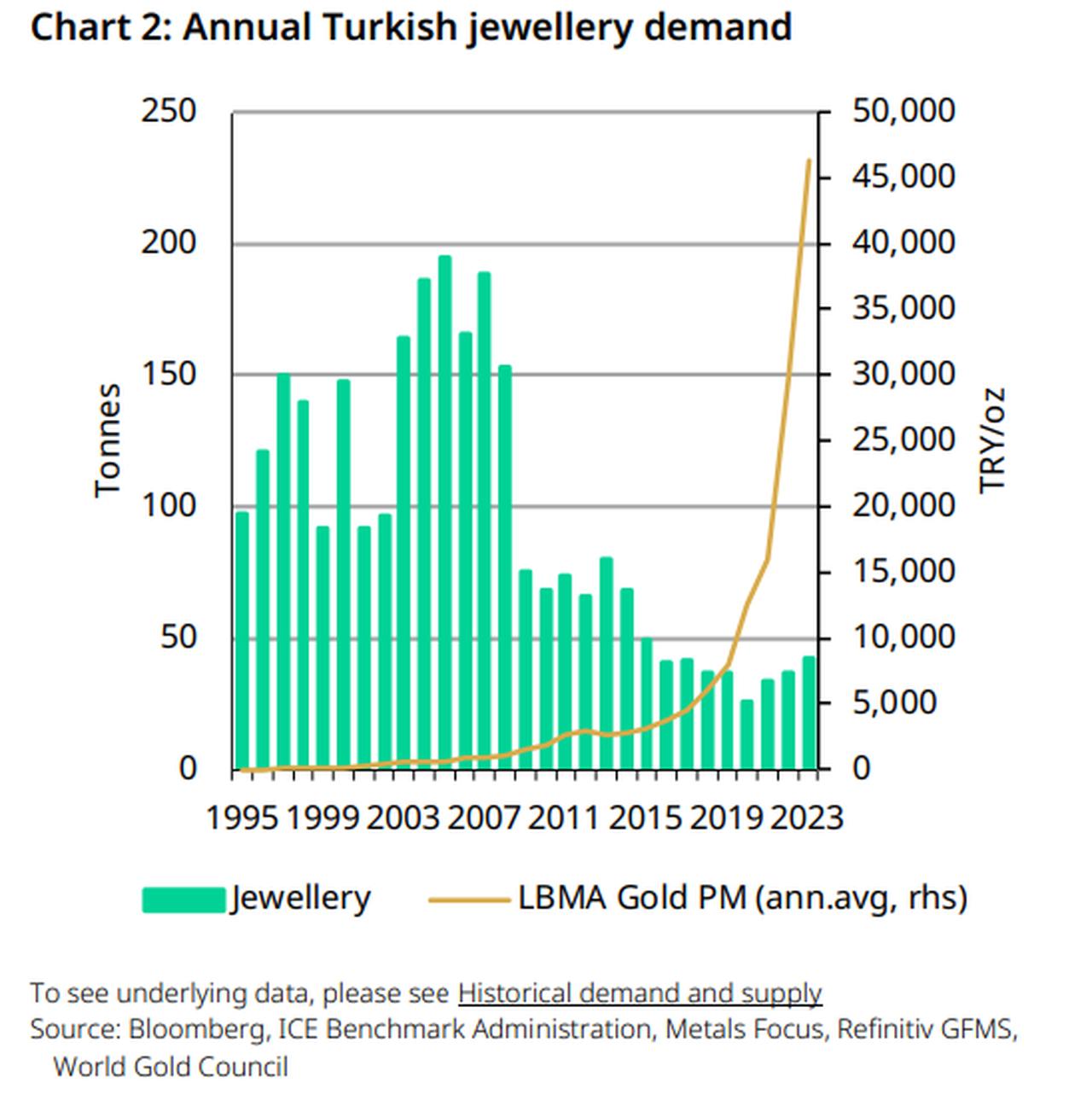 Türkiye’s gold jewelry demand remained structurally strong throughout the late 1990s and early 2000s, consistently exceeding 150 tonnes annually, largely supported by relatively affordable gold prices and steady economic growth. Demand peaked in the early 2000s, aligning with a period of double-digit real GDP expansion.