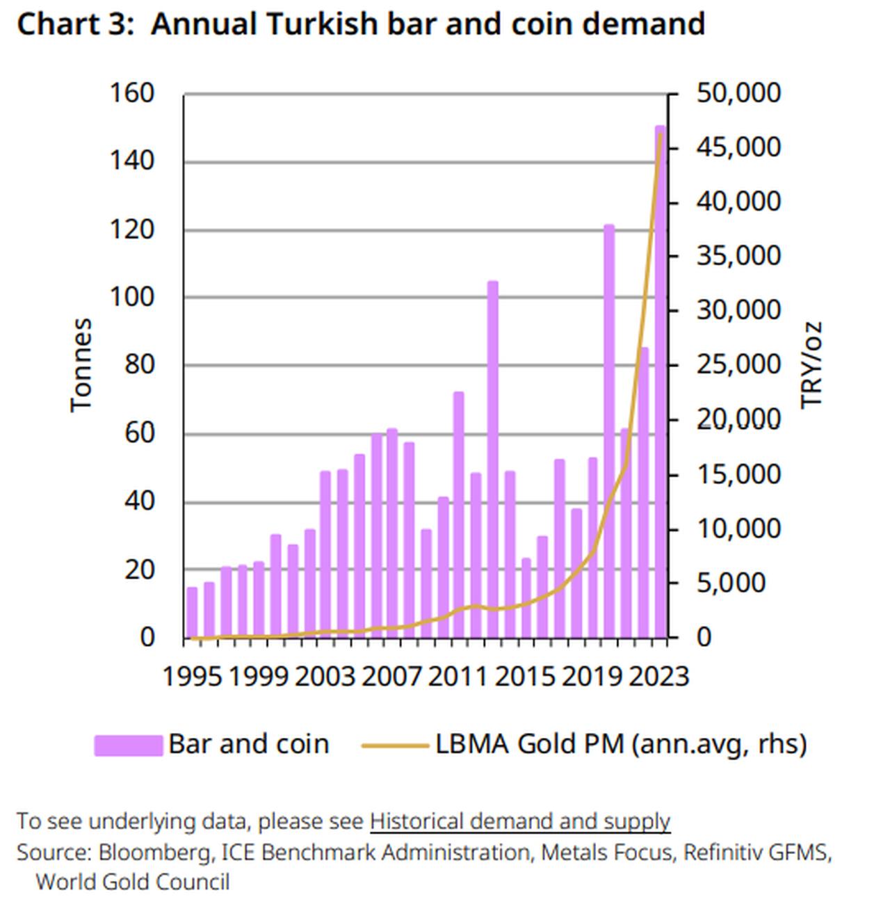 According to the World Gold Council's 2024 estimates, the total volume of gold in the Turkish economy exceeds 4,500 tonnes, with the majority held by households.