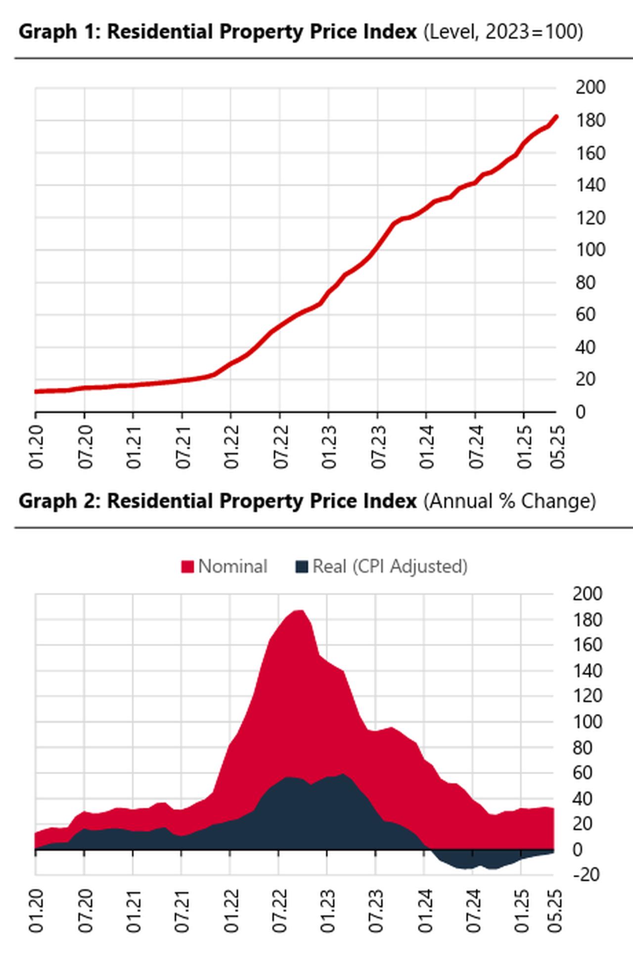 Among the three largest cities, housing prices rose month-on-month by 2.7% in Istanbul, 3.8% in Ankara, and 3% in Izmir. Compared to May 2024, the RPPI was up 32.6% in Istanbul, 41.4% in Ankara, and 31.1% in Izmir.