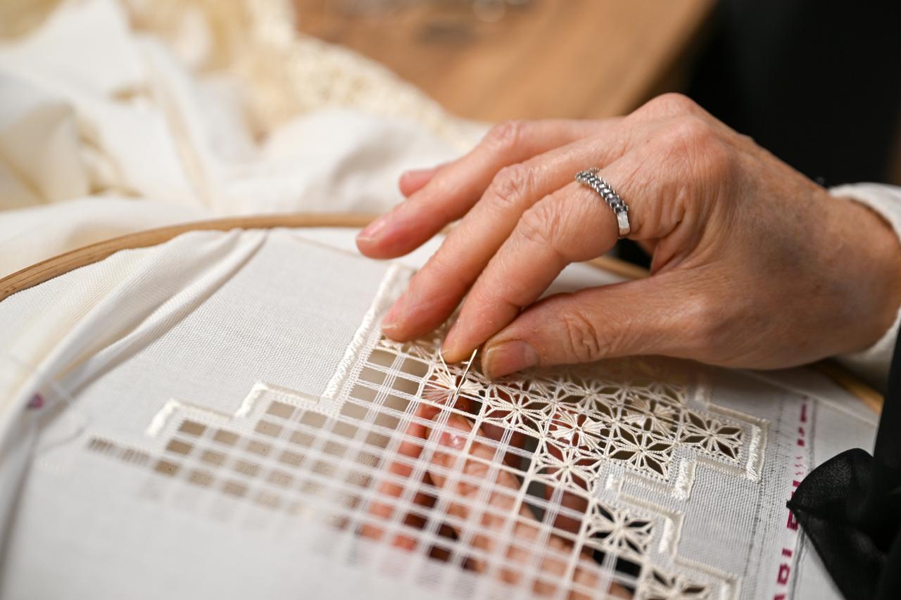 Antep embroidery is traditionally made with white thread on white fabric, and it is produced by pulling and cutting threads to form patterns. The technique is described as deep-rooted in the region and as having been handed down from generation to generation for centuries.