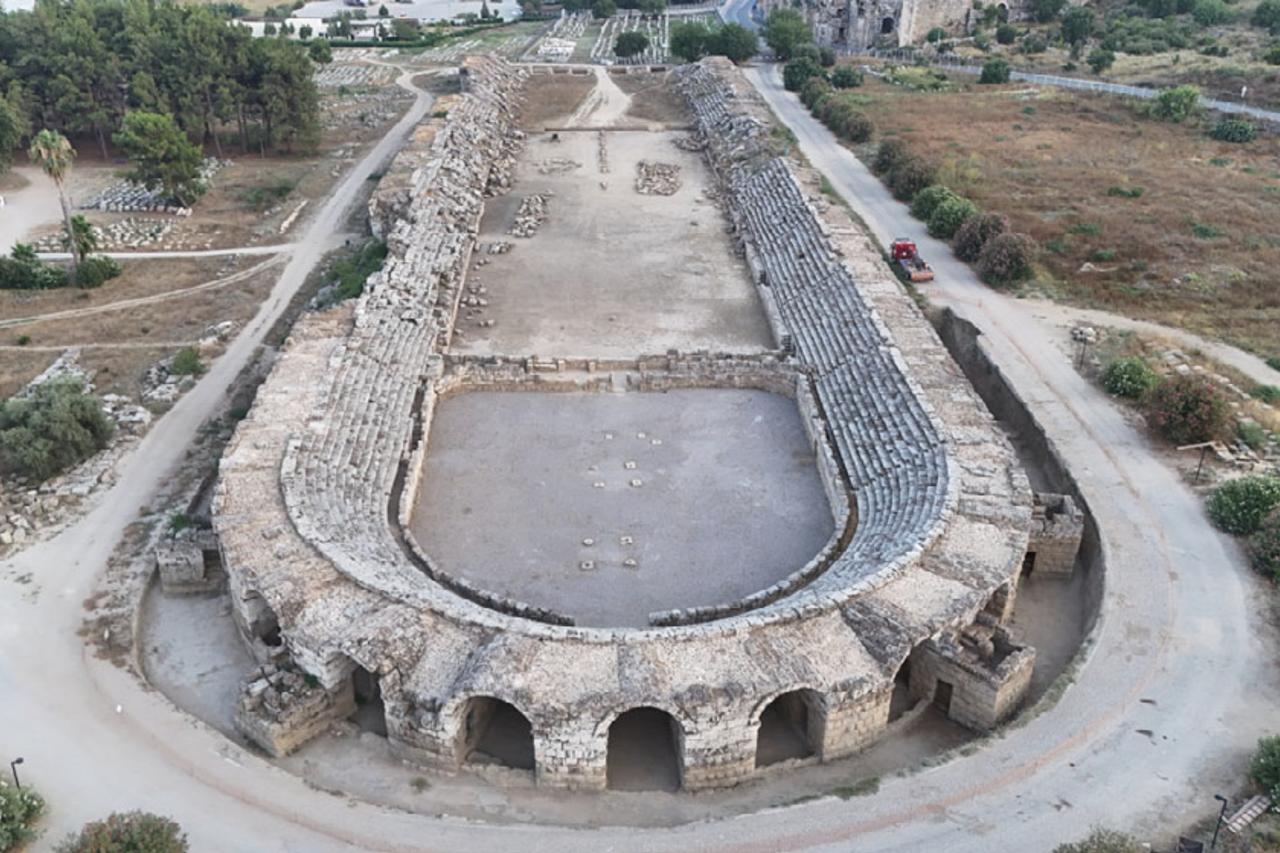 The stadium, originally built during the Roman period, underwent a significant transformation between the late third and fourth centuries A.D., when it was adapted into an amphitheatre-like structure designed for Roman spectacles.