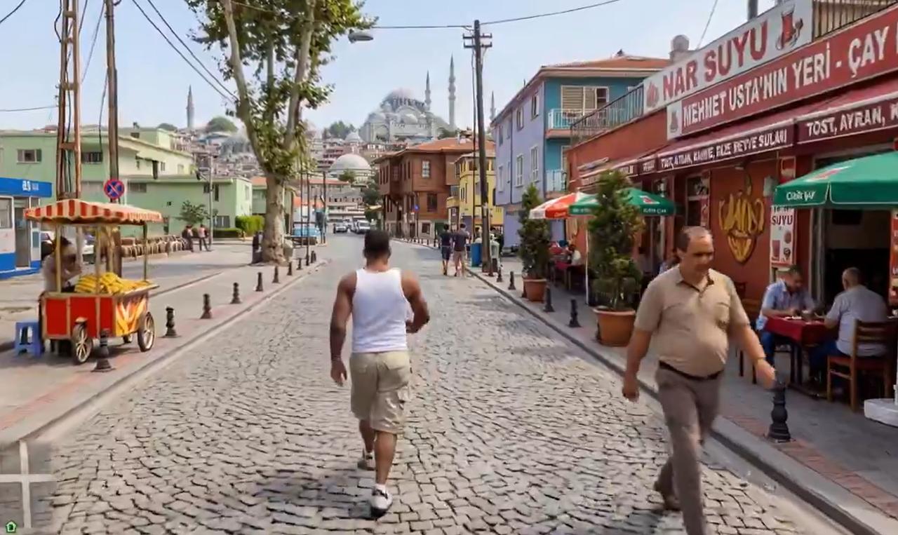 The clip presents a reworked version of the open-world action game, widely known as GTA V, placing its characters and gameplay into environments inspired by Türkiye. The scenes move through busy city streets, where yellow taxis, street vendors, and Ottoman-style architecture shape the setting, offering a localized reinterpretation of the game’s original Los Angeles-based design.