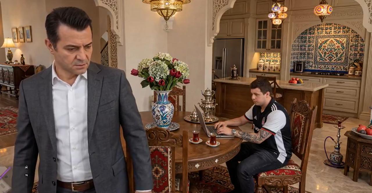 Interior shots further expand the reinterpretation, placing characters inside traditionally decorated homes, complete with ornate furnishings and tea service, which may be unfamiliar to global viewers but reflect common elements of Turkish domestic culture.