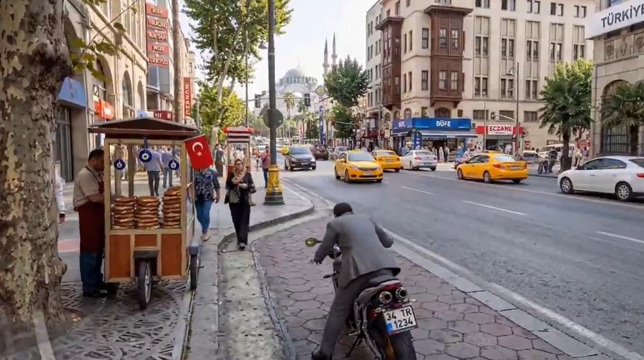 In several moments, the visuals recreate everyday urban details, including simit carts, midye dolma (stuffed mussels) stands, and storefront signage in Turkish.