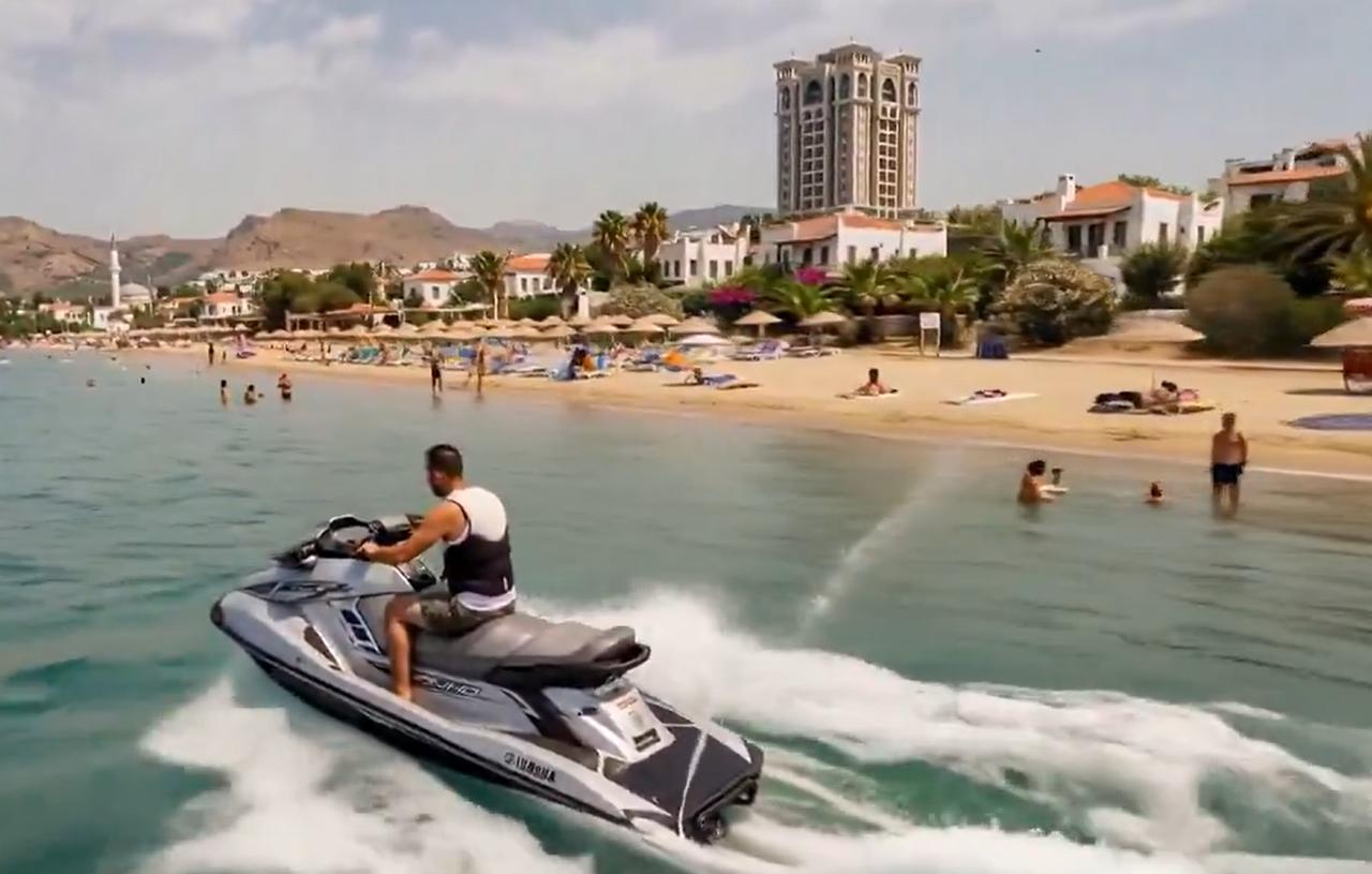 Beyond the city, the video transitions to coastal regions, where boats, jet skis, and seaside resorts feature prominently. These segments draw on imagery associated with Türkiye’s tourism industry, showing whitewashed houses, marinas, and beach life.