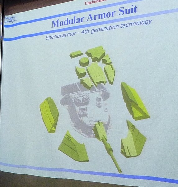 Armor: Composite matrix of laminated ceramic-steel-nickel alloy. Sloped modular design.