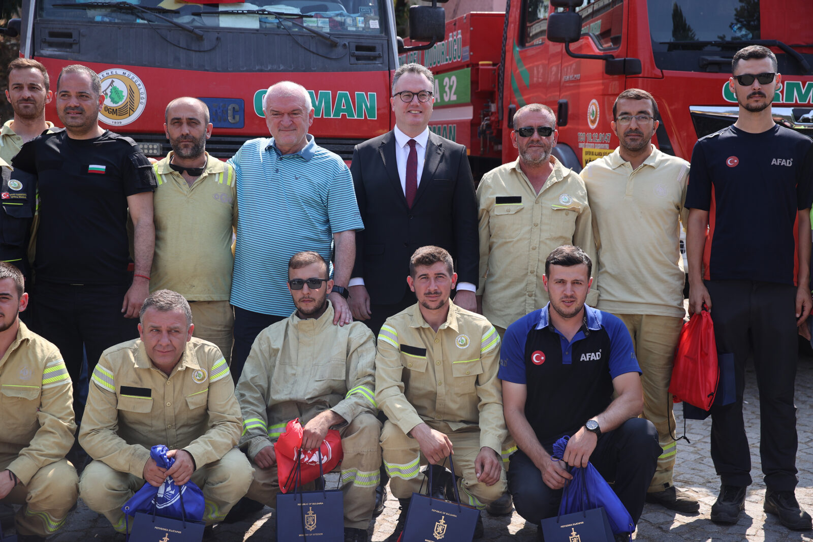 Bulgarian Prime Minister Dimitar Borisov Glavchev, Consul General of Plovdiv Korhan Kungeru, and Bulgarian Interior Minister Kalin Stoyanov pose for a photo with Turkish firefighters during the program in Voden Village, near the city of Plovdiv, Bulgaria on July 21, 2024. (AA Photo)